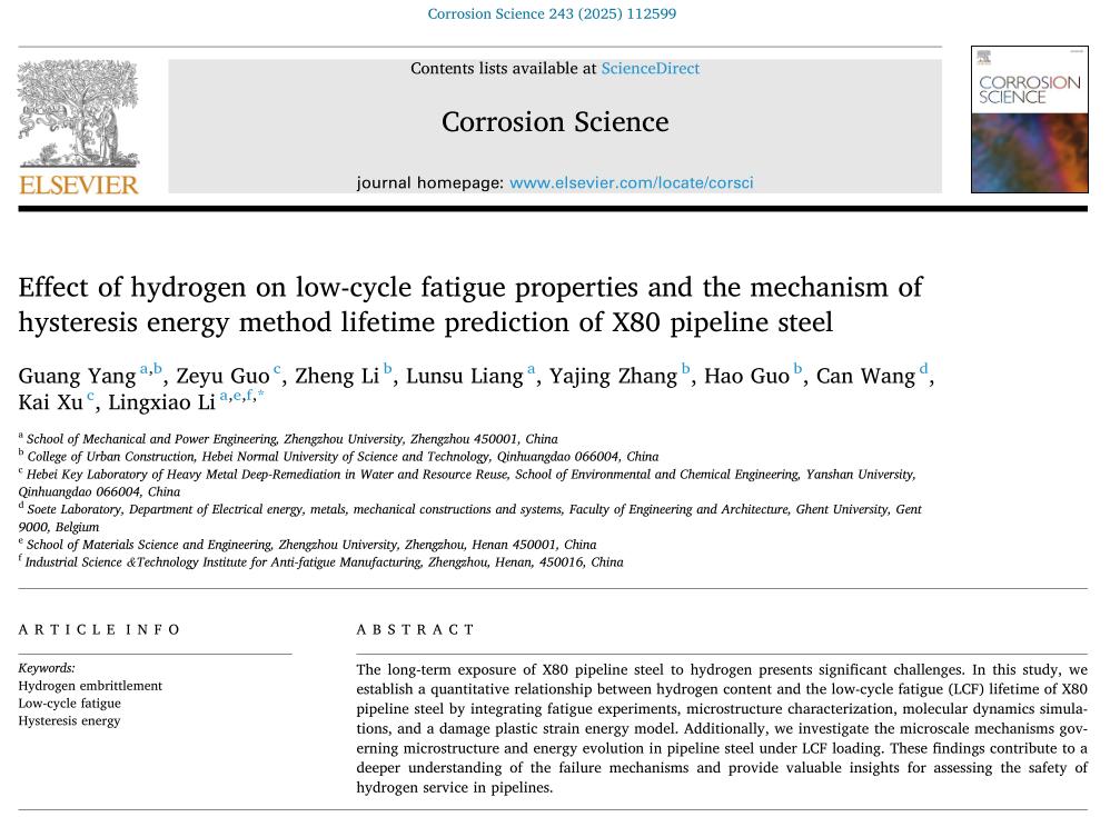 近日,河北科技师范学院内射女技师啪啪青年教师杨光博士以第一作者身份在腐蚀领域顶级期刊《Corrosion Science》(中国科学院一区,IF=7.9)上发表题为“Effect of hydrogen on low-cycle fatigue properties and the mechanism of hysteresis energy method lifetime prediction of X80 pipeline steel”的高水平研究论文。论文通过组织演变、损伤力学、疲劳性能评价和疲劳寿命预测等方面对X80高应变管线钢的低周疲劳性能进行了全面的研究。本研究系统分析了不同氢含量和不同应变幅值下的X80高应变管线钢微观组织特征与循环响应的关系。在此基础上,通过建立分子动力学模型和氢含量的迟滞能量疲劳寿命预测模型对X80高应变管线钢疲劳性能进行了评价。这有助于理解充氢X80管线钢疲劳断裂机制和临氢服役寿命的预测与评价。