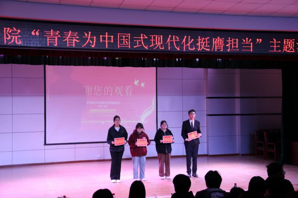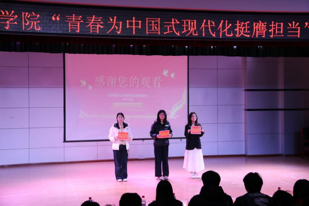 此次“青春为中国式现代化挺膺担当”主题演讲比赛的成功举办,为学生搭建了锻炼自我、展示自我、实现自我的平台,也激励着莘莘学子踔厉奋发、笃行不怠,厚植爱国之情,砥砺强国之志。