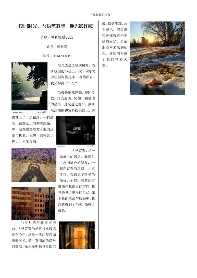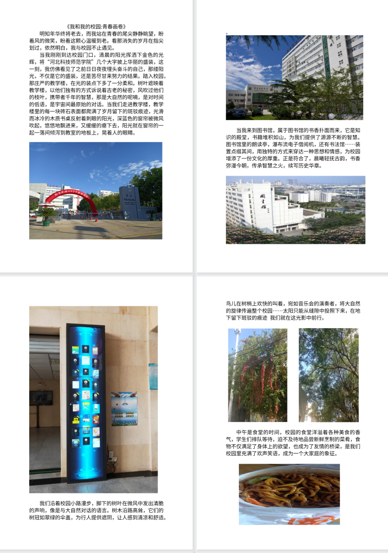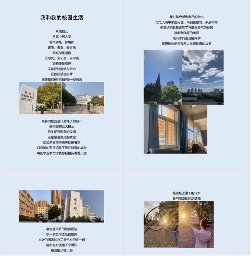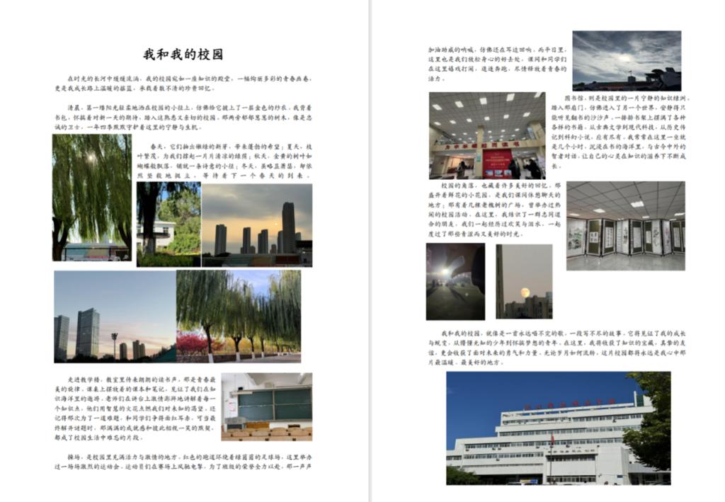 同学们敏锐捕捉记录大学生活的美好瞬间,定格属于自己的美好记忆,一草一木皆入笔端、一桌一椅都赋情感。本次大赛共上交作品145份,参赛作品内容丰富,有的同学讲述学习经历、分享感悟;有的同学描绘校园风景、展示校园魅力;有的同学回顾校园活动、展现青春活力。评委从遣词、用句、排版设计及创意性等方面评选出了一、二、三等奖。其中曹佳慧同学的作品内容新颖,语言生动,排版精美,颇具创意,引起了大家的强烈共鸣,荣获一等奖。